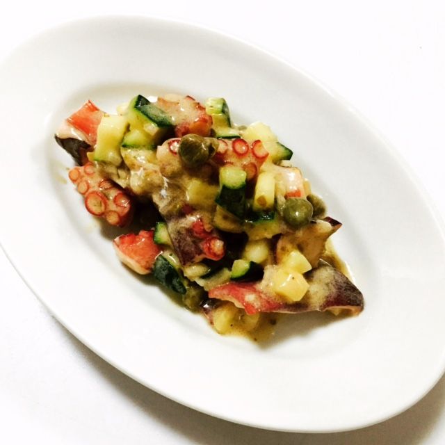 タコをズッキーニ・エシャロット・ケッパーと共に自家製マヨと